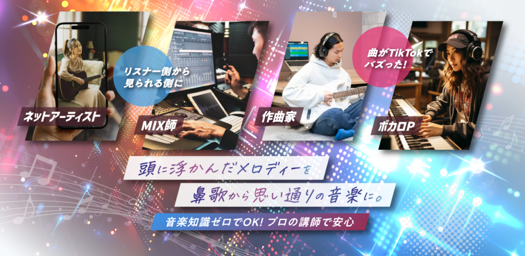 作曲家志望者や歌ってみた制作者など、個人で音楽活動を行う人たちを中心に、マンツーマン指導を通じて「自分の音楽を形にする力」を育てます。